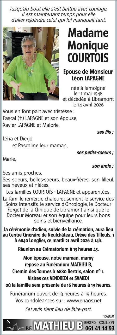 Décédée à Libramont (6800) le mardi 14 avril 2026 à l'âge de 77 ans