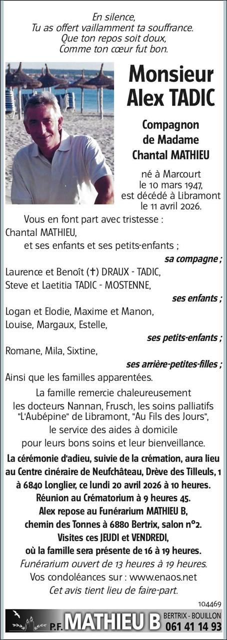 Décédé à Libramont (6800) le lundi 13 avril 2026 à l'âge de 79 ans