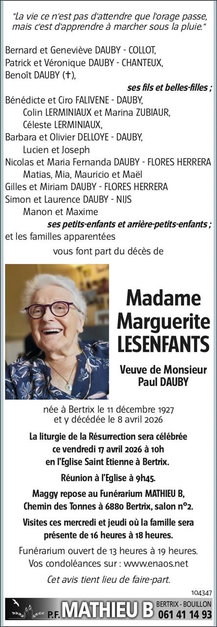 Décédée à Bertrix (6880) le lundi 13 avril 2026 à l'âge de 98 ans