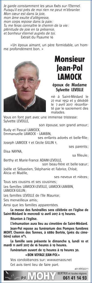 Décédé à Saint-Médard (6887) le vendredi 7 avril 2017 à l'âge de 64 ans