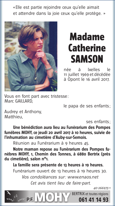 Décédée à Opont (6852) le dimanche 16 avril 2017 à l'âge de 47 ans
