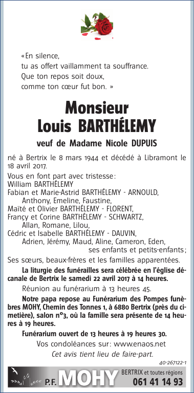 Décédé à Libramont (6800) le mardi 18 avril 2017 à l'âge de 73 ans