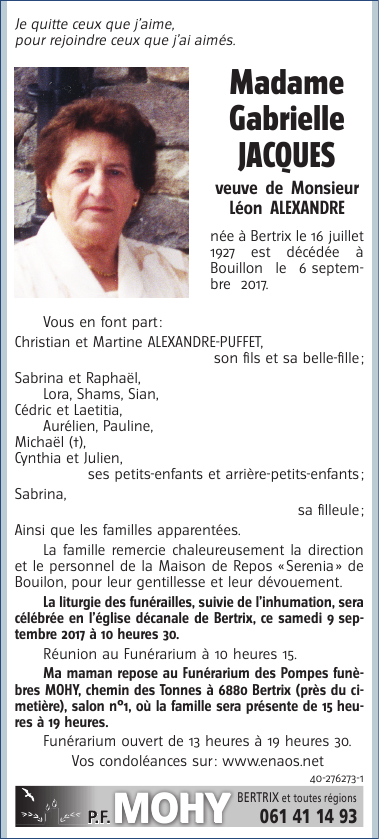 Décédée à Bouillon (6830) le mercredi 6 septembre 2017 à l'âge de 90 ans