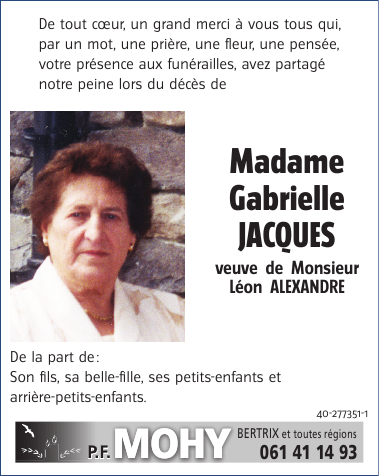 Décédée à Bouillon (6830) le mercredi 6 septembre 2017 à l'âge de 90 ans