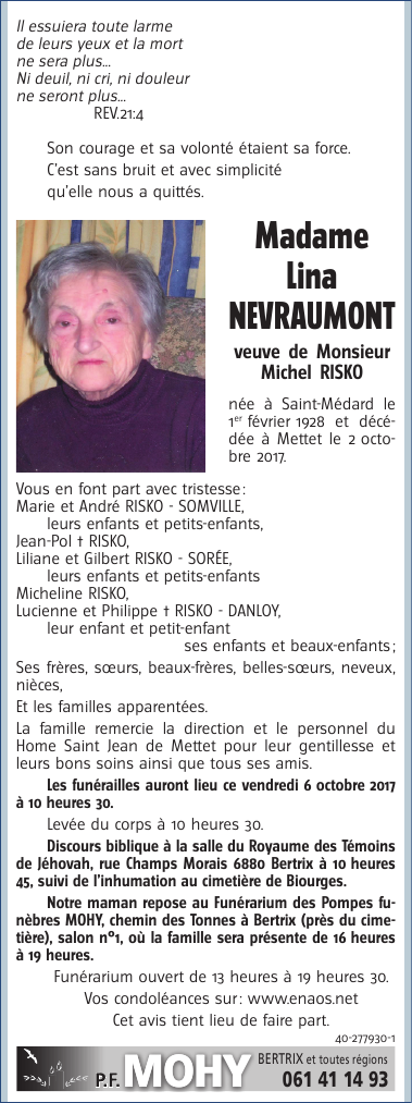 Décédée à Mettet (5640) le lundi 2 octobre 2017 à l'âge de 89 ans