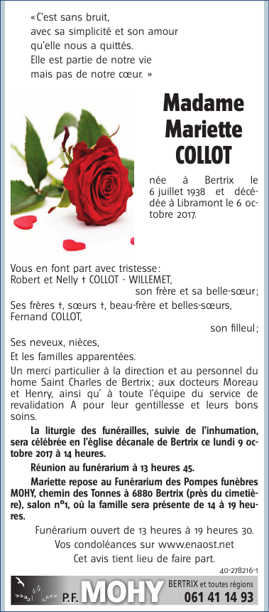 Décédée à Libramont (6800) le vendredi 6 octobre 2017 à l'âge de 79 ans
