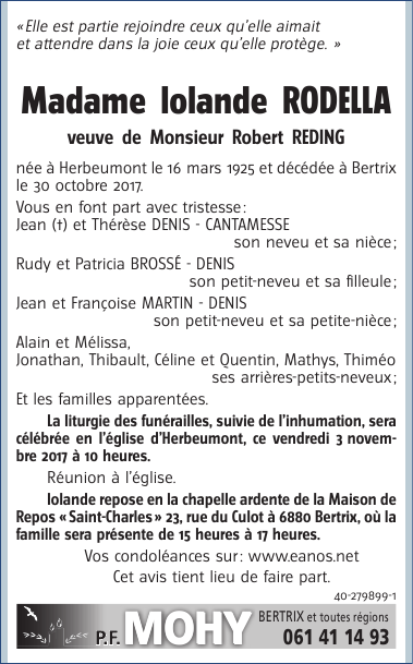 Décédée à Bertrix (6880) le lundi 30 octobre 2017 à l'âge de 92 ans