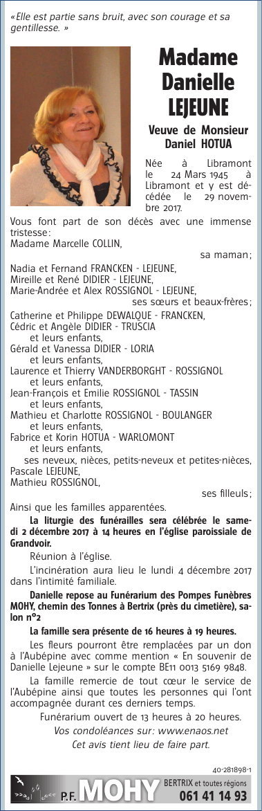 Décédée à Libramont (6800) le mercredi 29 novembre 2017 à l'âge de 72 ans
