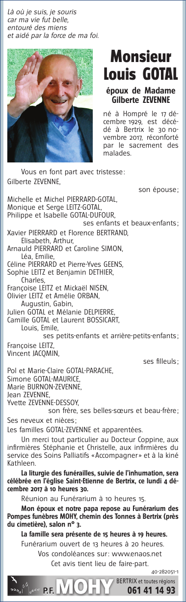 Décédé à Bertrix (6880) le jeudi 30 novembre 2017 à l'âge de 87 ans