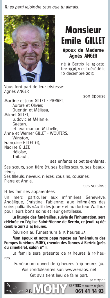 Décédé à Bertrix (6880) le dimanche 10 décembre 2017 à l'âge de 81 ans