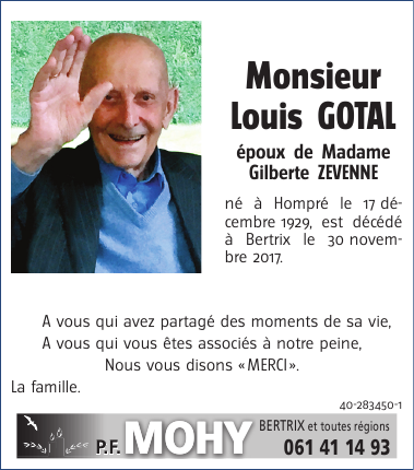 Décédé à Bertrix (6880) le jeudi 30 novembre 2017 à l'âge de 87 ans