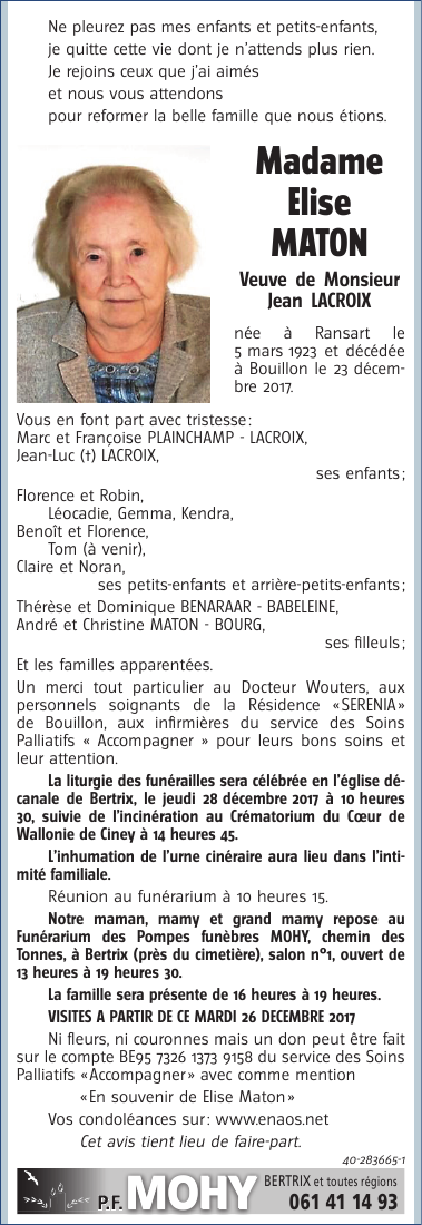 Décédée à Bouillon (6830) le samedi 23 décembre 2017 à l'âge de 94 ans