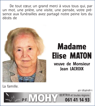 Décédée à Bouillon (6830) le samedi 23 décembre 2017 à l'âge de 94 ans