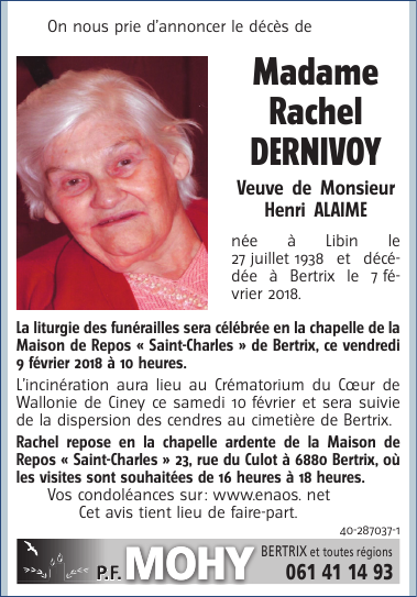 Décédée à Bertrix (6880) le mercredi 7 février 2018 à l'âge de 79 ans