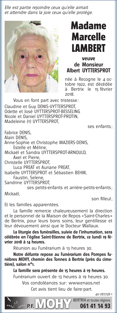 Décédée à Bertrix (6880) le jeudi 15 février 2018 à l'âge de 95 ans
