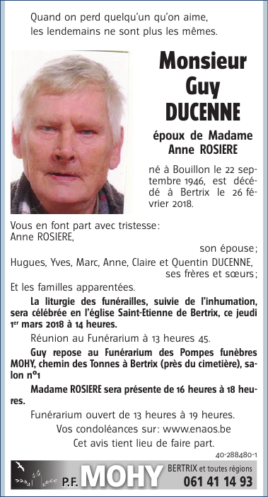 Décédé à Bertrix (6880) le lundi 26 février 2018 à l'âge de 71 ans