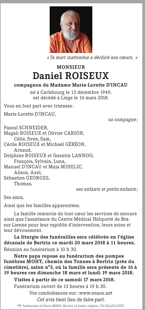 Décédé à Liège (4000) le mercredi 14 mars 2018 à l'âge de 68 ans