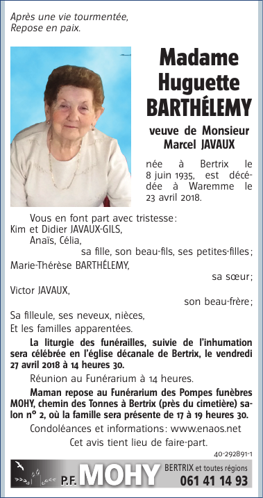 Décédée à Waremme (4300) le lundi 23 avril 2018 à l'âge de 82 ans
