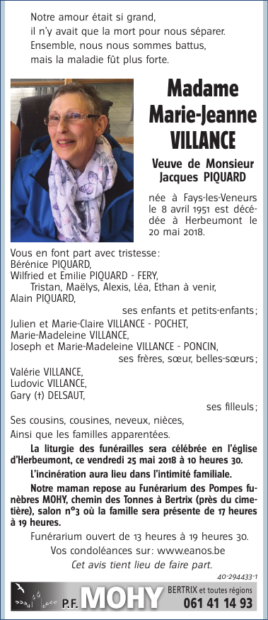 Décédée à Herbeumont (6887) le dimanche 20 mai 2018 à l'âge de 67 ans