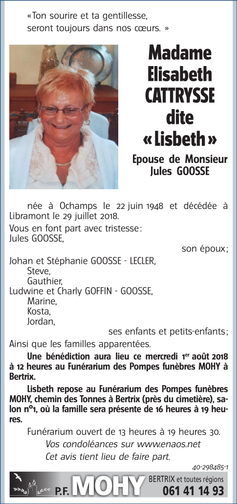 Décédée à Libramont (6800) le dimanche 29 juillet 2018 à l'âge de 70 ans
