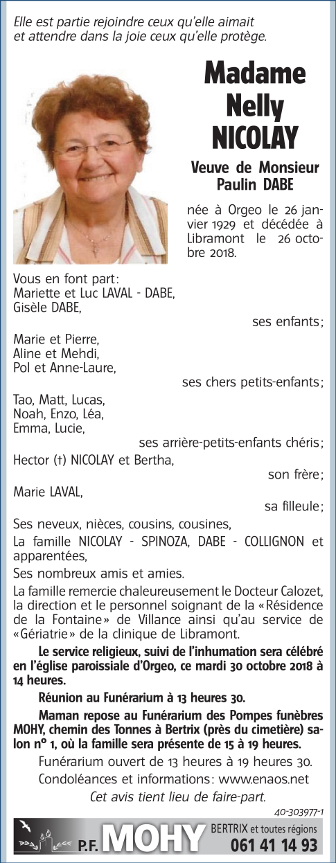 Décédée à Libramont (6800) le vendredi 26 octobre 2018 à l'âge de 89 ans