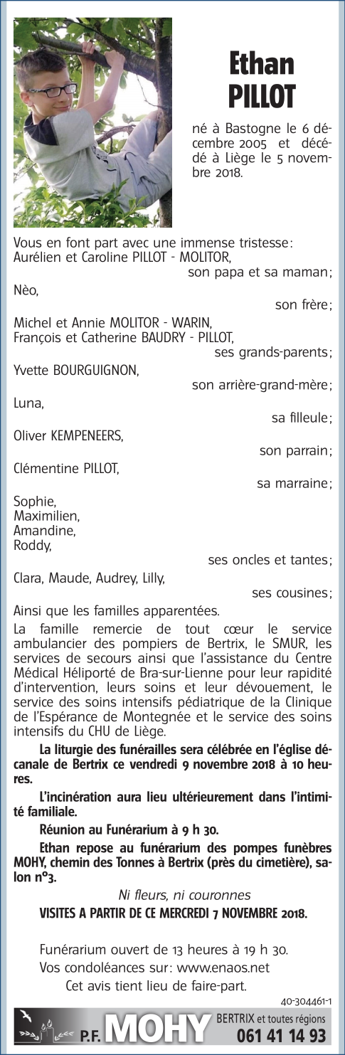 Décédé à Liège (4000) le lundi 5 novembre 2018 à l'âge de 12 ans