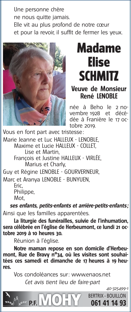 Décédée à Franière (5150) le vendredi 18 octobre 2019 à l'âge de 90 ans