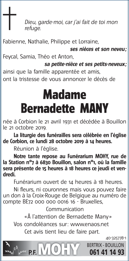 Décédée à Bouillon (6830) le lundi 21 octobre 2019 à l'âge de 88 ans