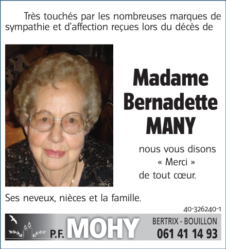 Décédée à Bouillon (6830) le lundi 21 octobre 2019 à l'âge de 88 ans