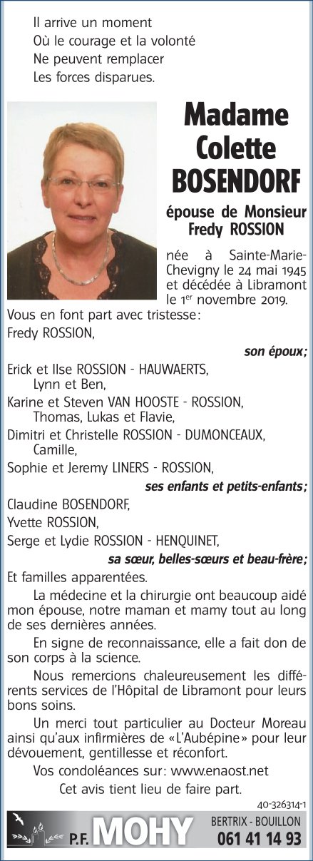Décédée à Libramont (6800) le vendredi 1 novembre 2019 à l'âge de 74 ans