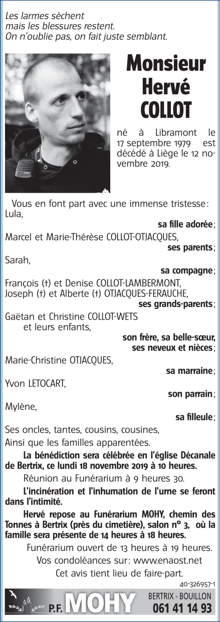 Décédé à Liège (4020) le mardi 12 novembre 2019 à l'âge de 40 ans
