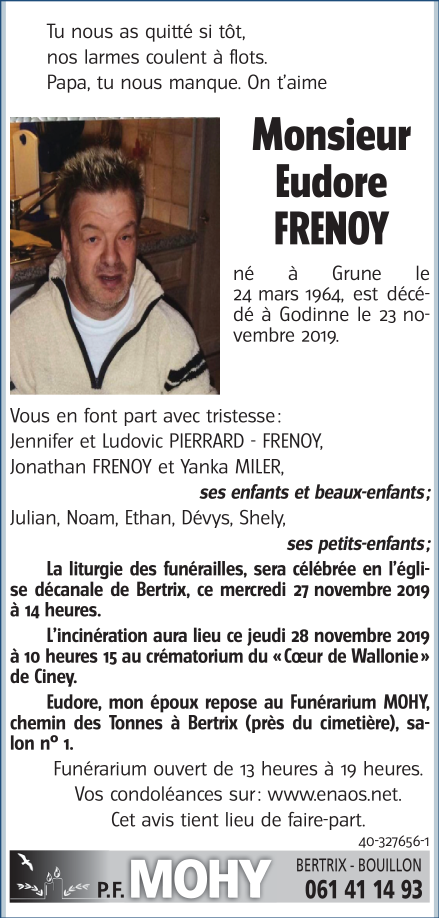 Décédé à Mont-Godinne (5530) le samedi 23 novembre 2019 à l'âge de 55 ans