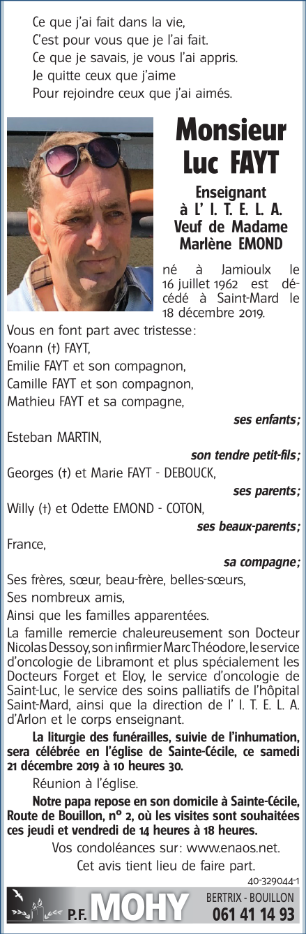 Décédé à Saint-Mard (6762) le mercredi 18 décembre 2019 à l'âge de 57 ans