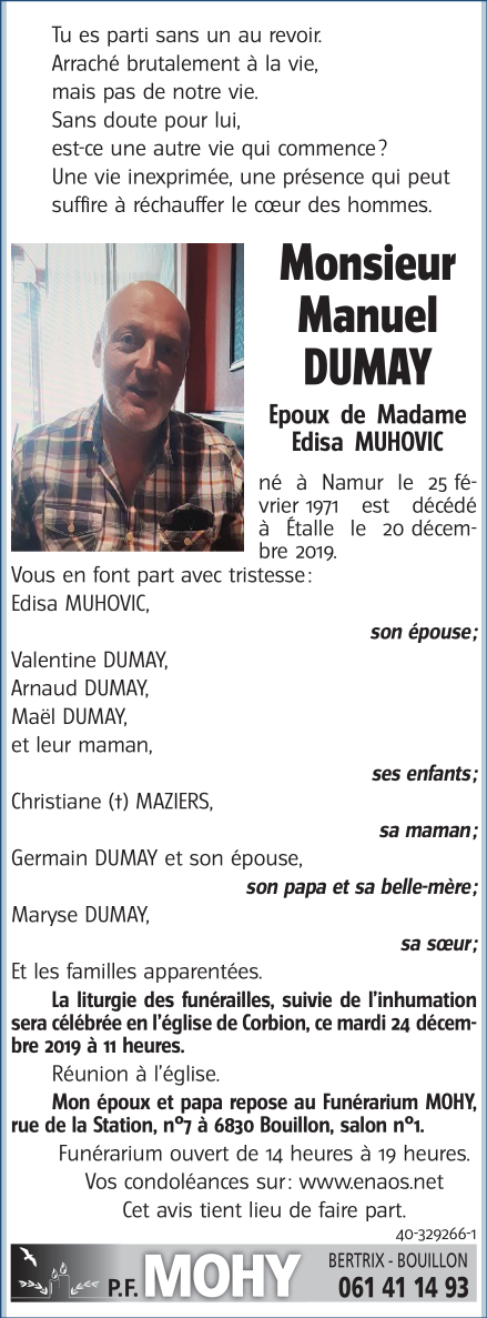 Décédé à Etalle (6740) le vendredi 20 décembre 2019 à l'âge de 48 ans