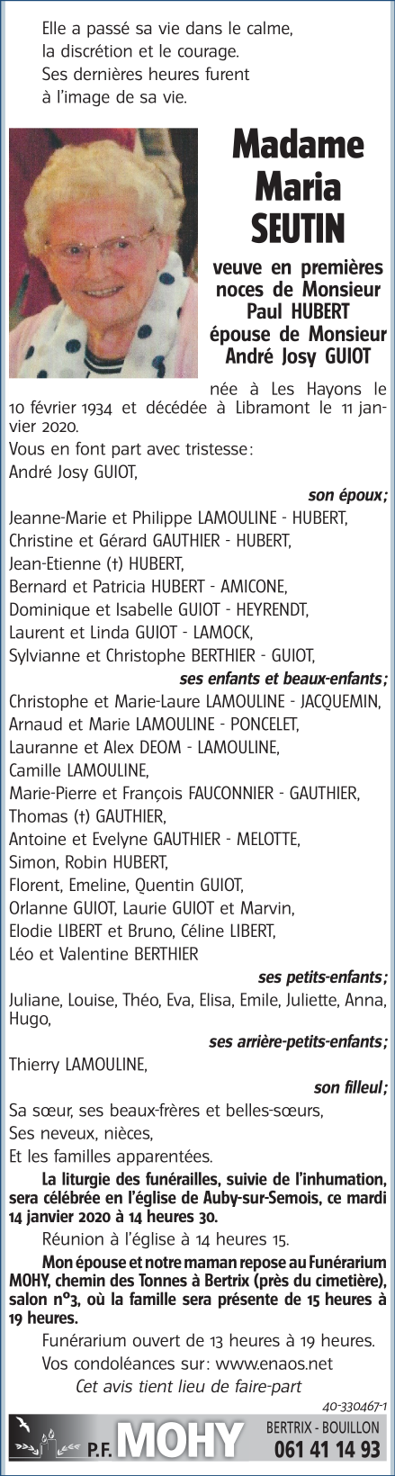 Décédée à Libramont (6800) le samedi 11 janvier 2020 à l'âge de 85 ans