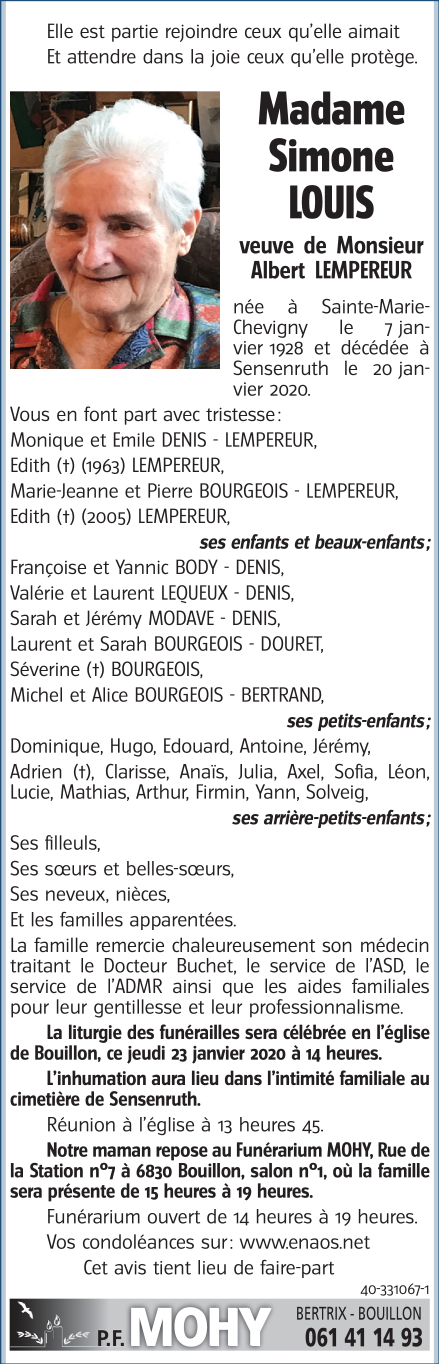 Décédée à Sensenruth (6832) le lundi 20 janvier 2020 à l'âge de 92 ans