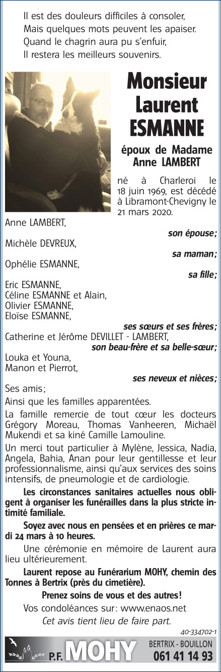 Décédé à Libramont (6800) le samedi 21 mars 2020 à l'âge de 50 ans