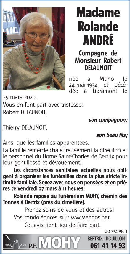 Décédée à Libramont (6800) le mercredi 25 mars 2020 à l'âge de 85 ans