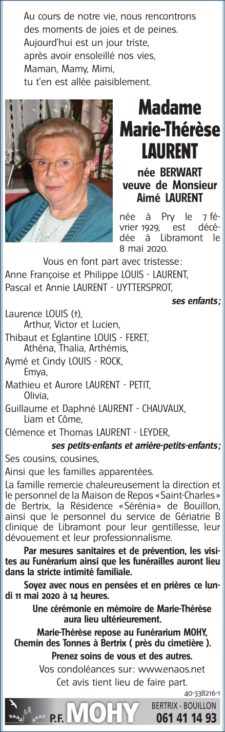 Madame Marie-Thérèse LAURENT née BERWART