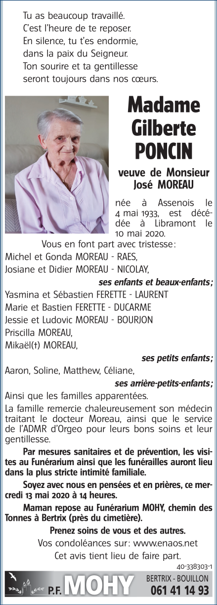 Décédée à Libramont (6800) le dimanche 10 mai 2020 à l'âge de 87 ans