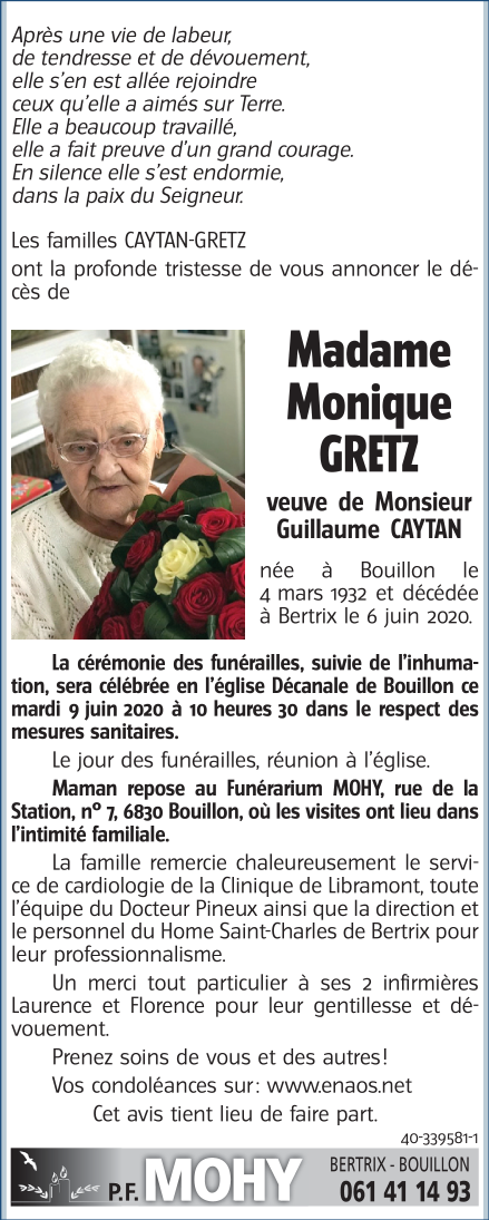 Décédée à Bertrix (6880) le samedi 6 juin 2020 à l'âge de 88 ans
