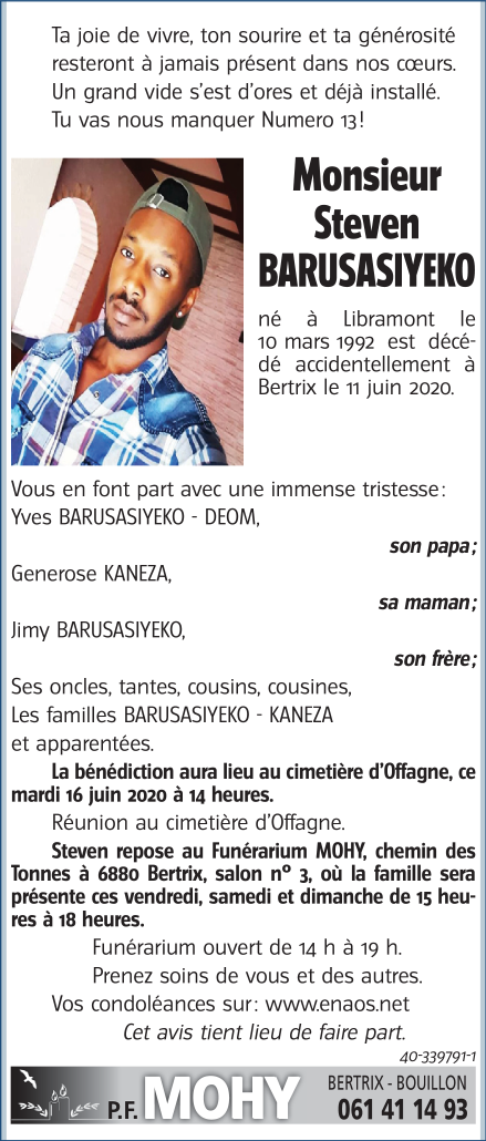 Décédé à Bertrix (6880) le jeudi 11 juin 2020 à l'âge de 28 ans