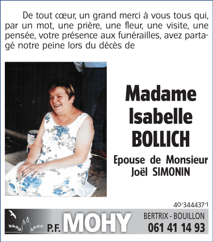 Décédée à Libramont (6800) le dimanche 6 septembre 2020 à l'âge de 57 ans