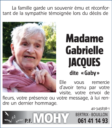 Née à Auby-sur-Semois (6880) le lundi 28 août 1944
