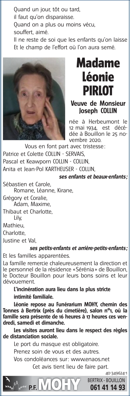 Décédée à Bouillon (6830) le mercredi 25 novembre 2020 à l'âge de 86 ans