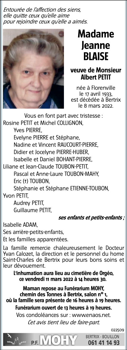 Décédée à Bertrix (6880) le mardi 8 mars 2022 à l'âge de 88 ans