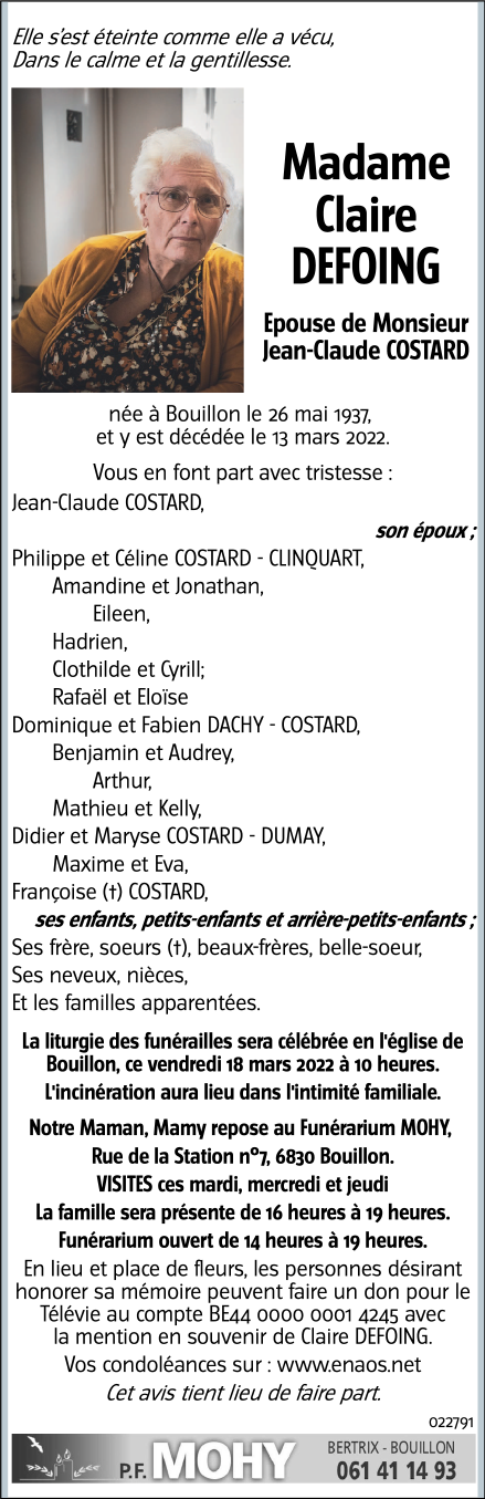 Décédé à Bouillon (6830) le dimanche 13 mars 2022 à l'âge de 84 ans