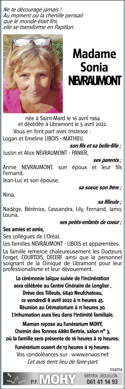 Décédée à Libramont (6800) le mardi 5 avril 2022 à l'âge de 57 ans