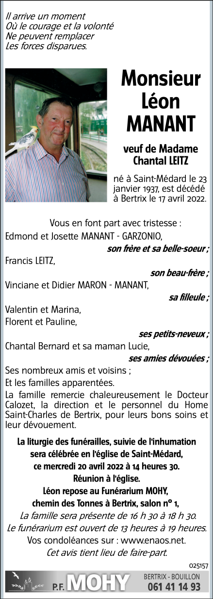Décédé à Bertrix (6880) le dimanche 17 avril 2022 à l'âge de 85 ans
