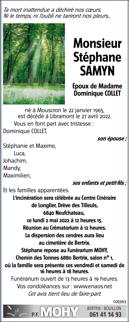 Décédé à Libramont (6800) le jeudi 28 avril 2022 à l'âge de 57 ans